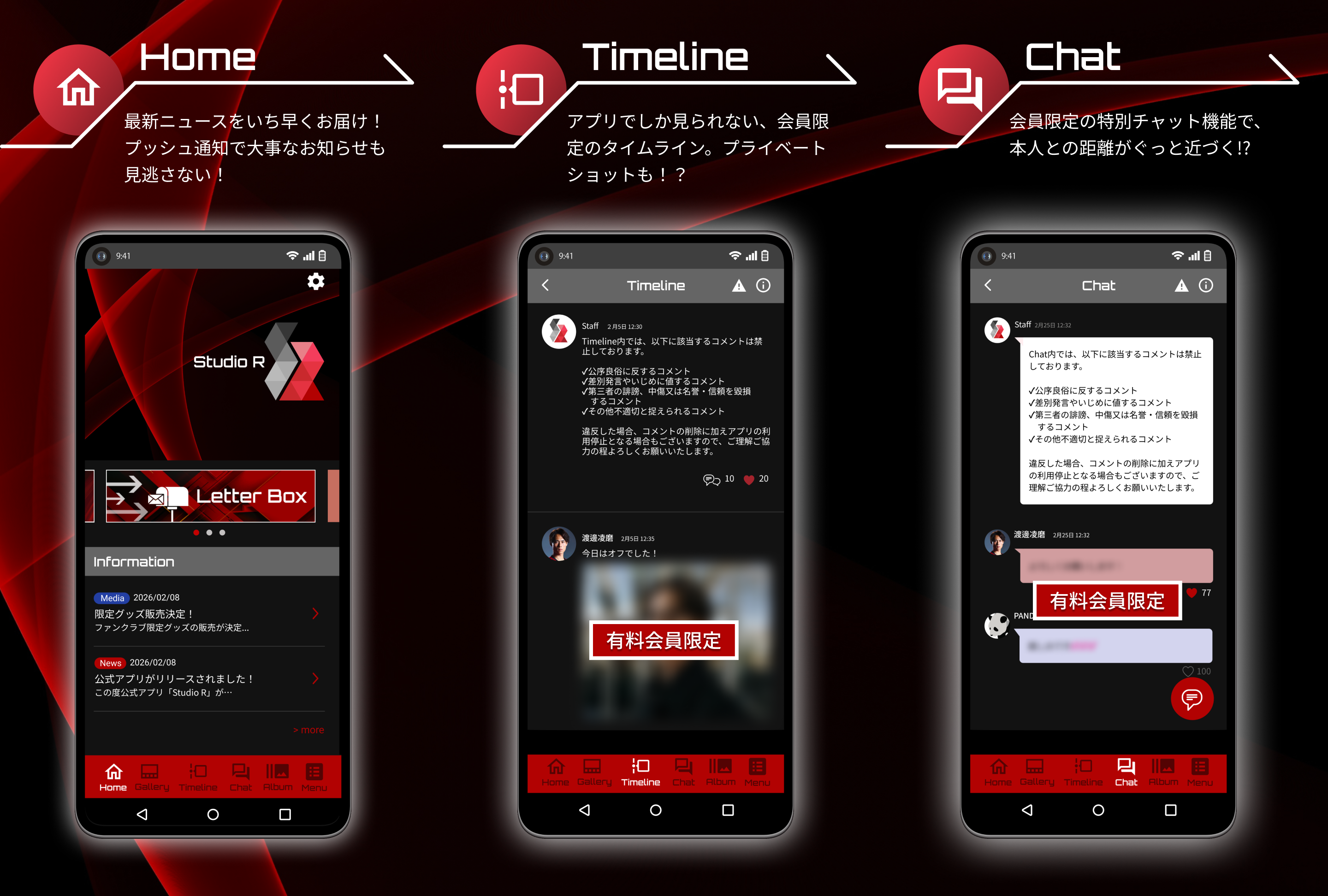 Information(公式情報)Timeline(渡邊凌磨・STAFFからメッセージ)Live(リアルタイムで配信をお届け)Gallery(限定写真・動画)Chat(渡邊凌磨・ユーザー同士でのやり取り)その他